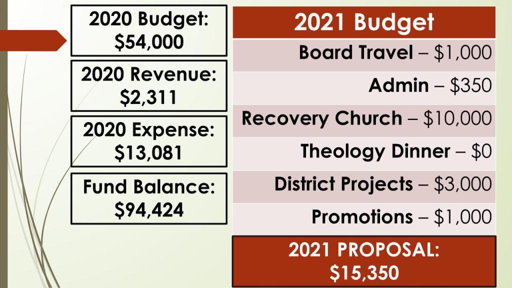 Credentialed leaders present unanimously approved Paulo Friere to begin a second term on the board. All other board members are continuing in their service. Leaders also approved the 2021 budget above.